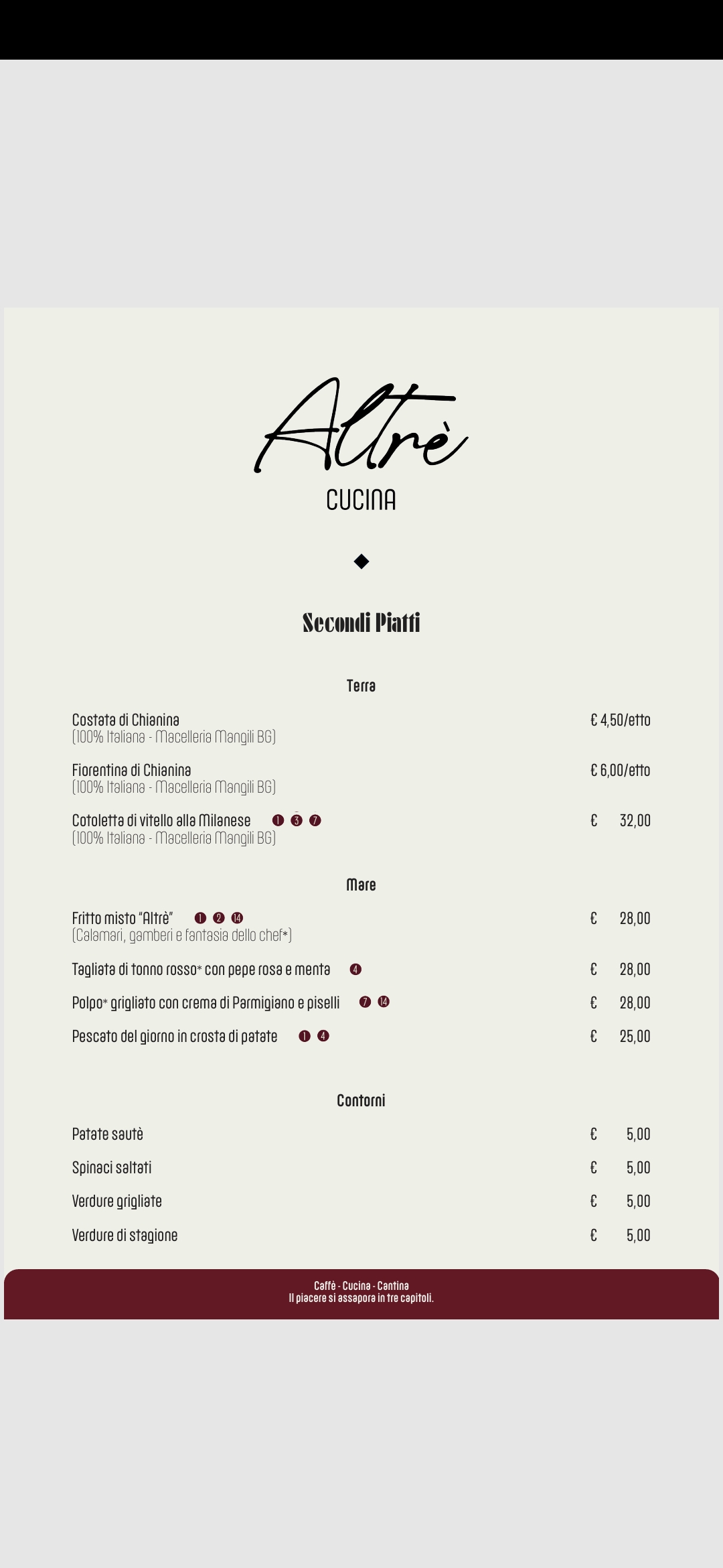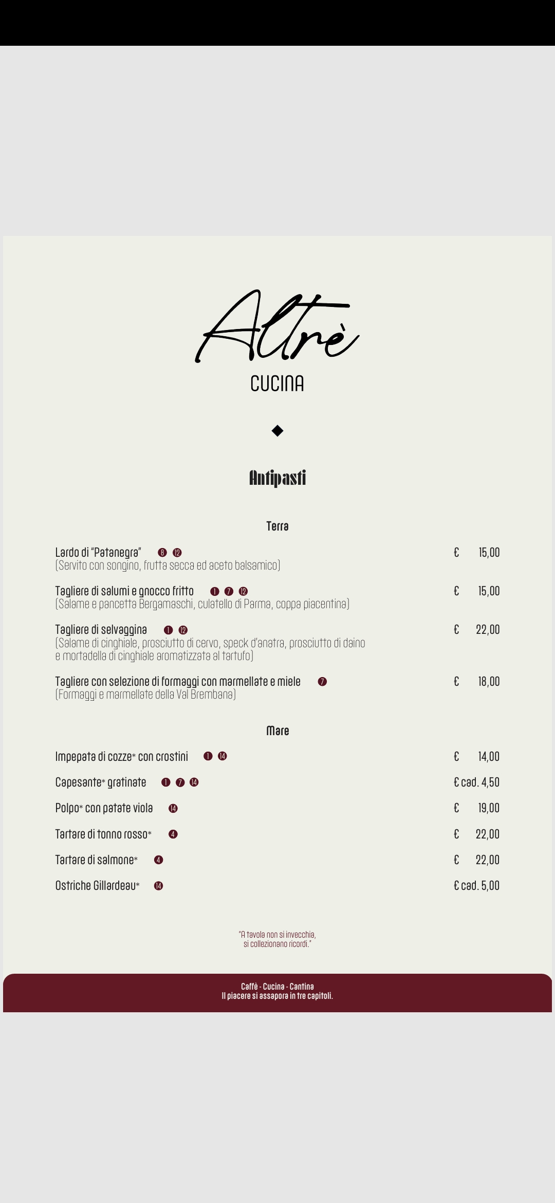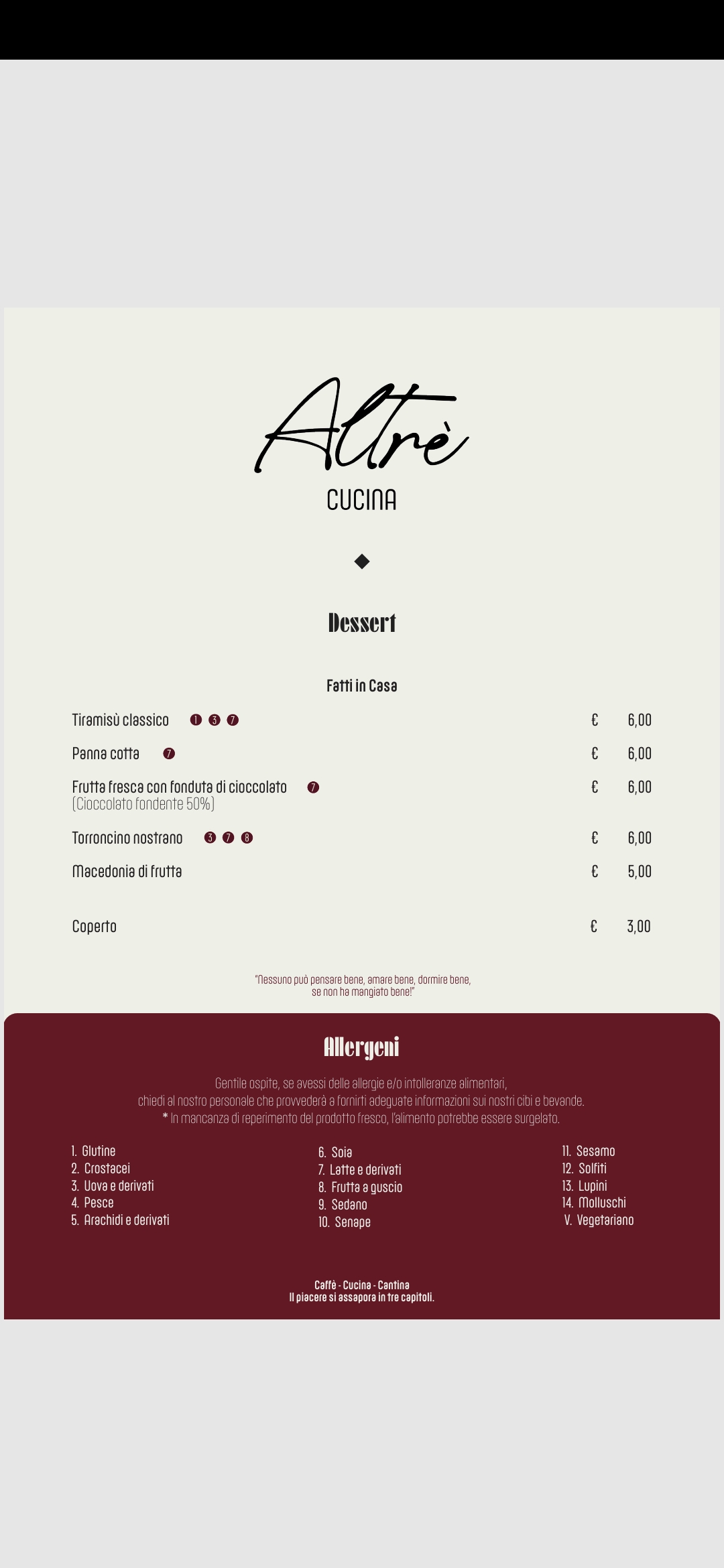Menu from Altrè Milano - Caffè • Cucina • Cantina