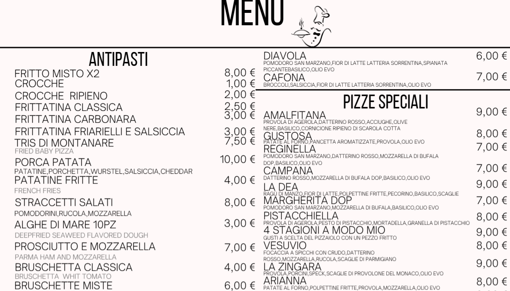 Menu from Dint'o Street Pizzeria Trattoria
