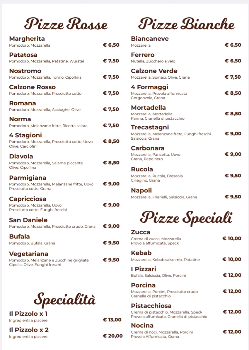 Menu from I Pizzari