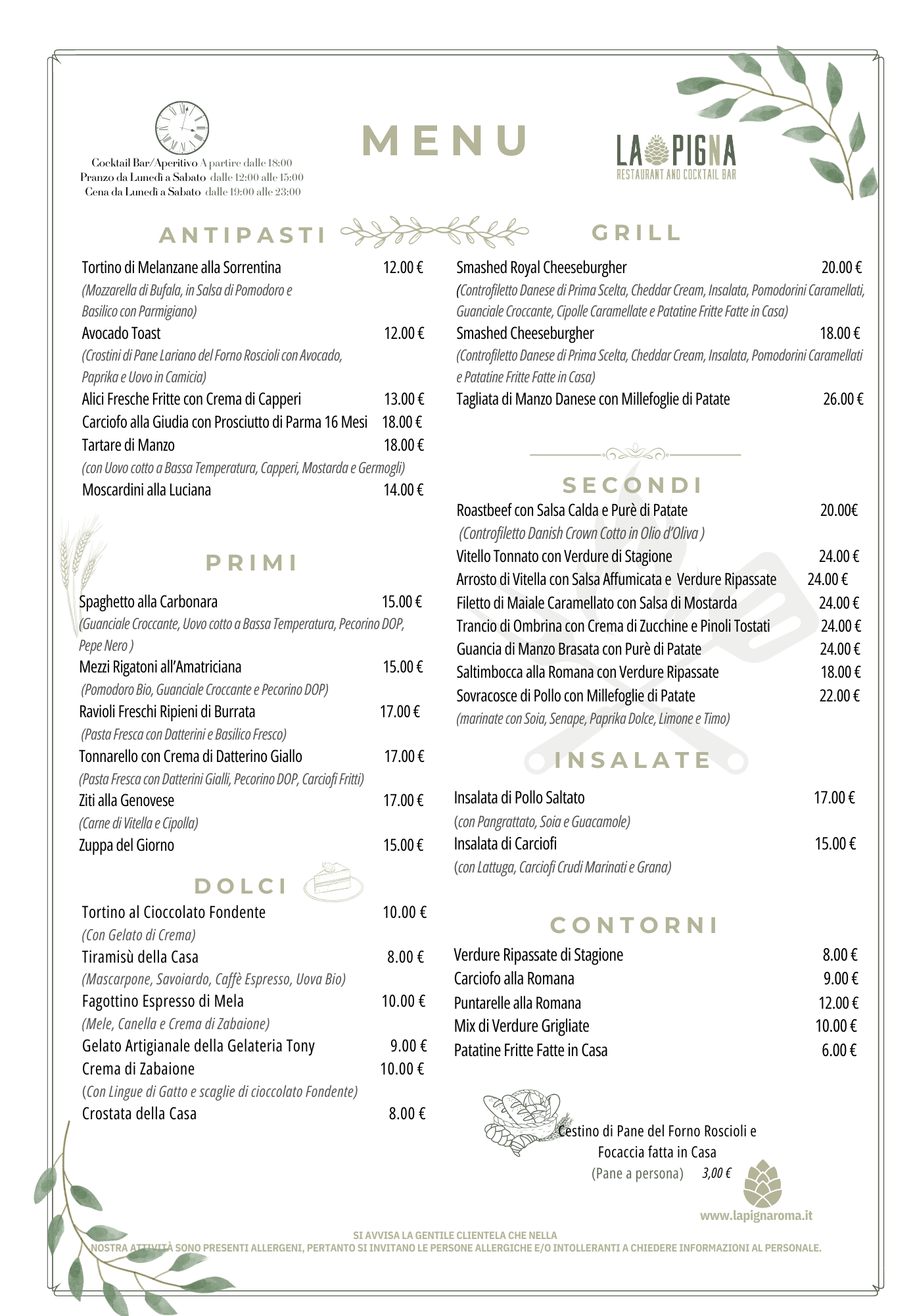 Menu from La Pigna Roma Cocktail Bar and Restaurant