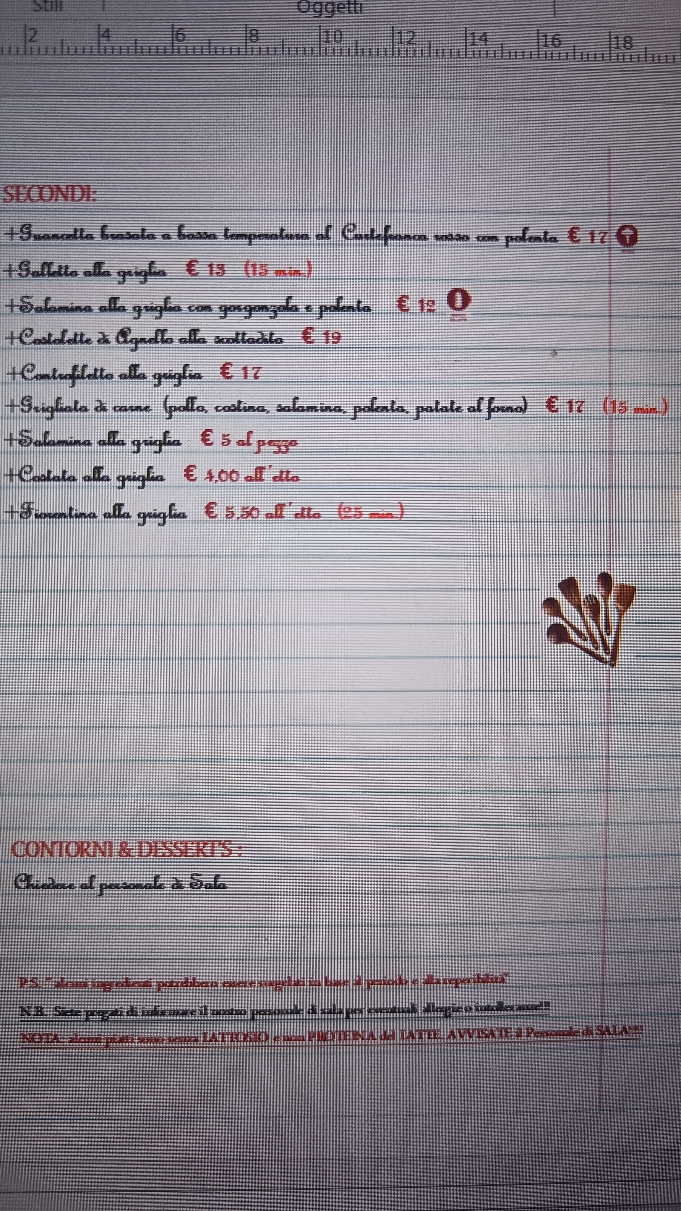primo a scelta, secondo a scelta, contorno a scelta, 1/5 acqua, 1/4 di vino della casa, caffè liscio, coperto