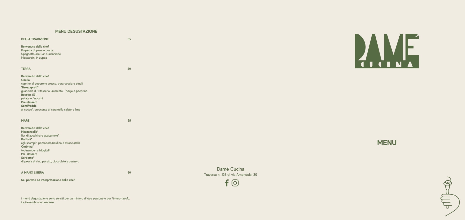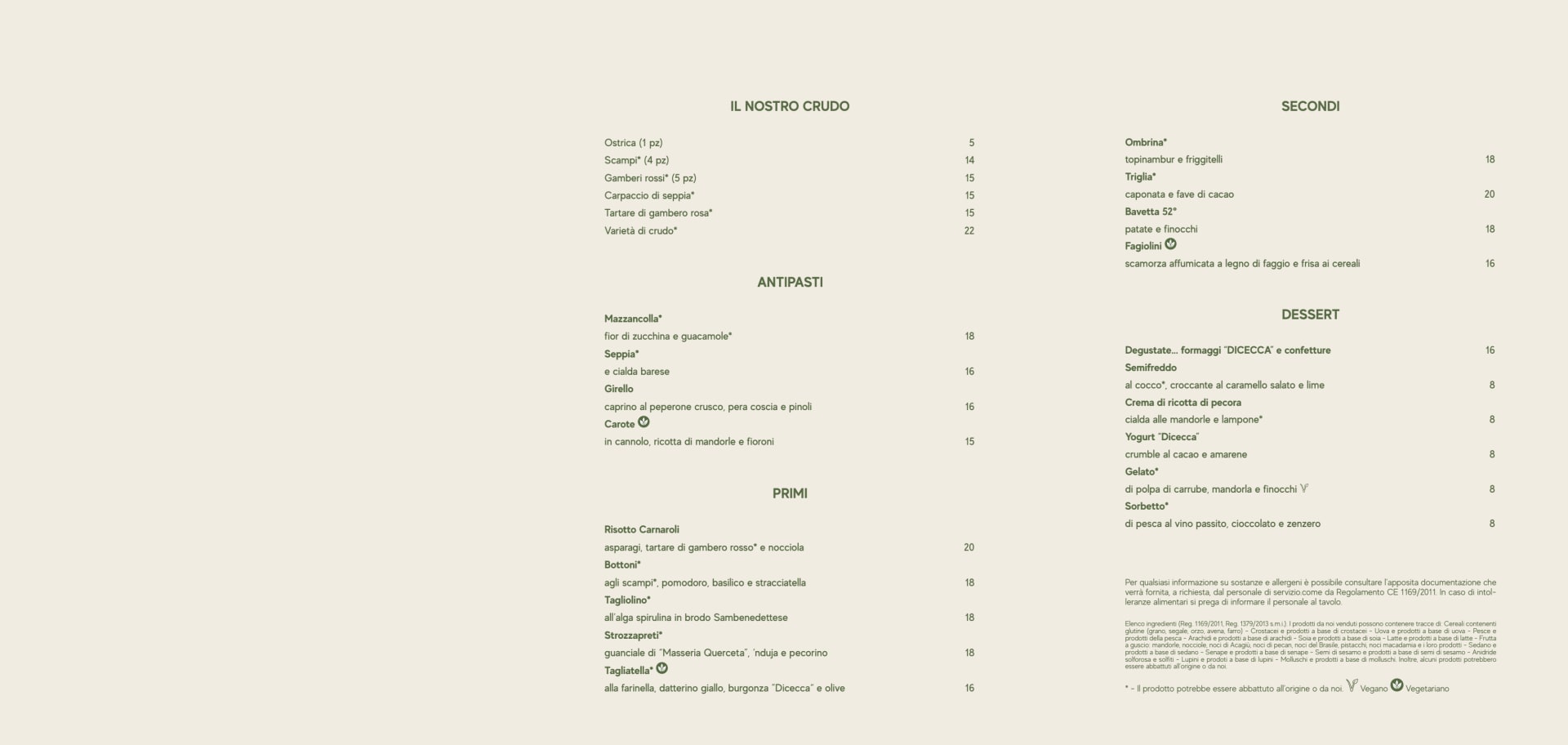 Il menù fisso include: First course + Second course + Third course + Fourth course + Fifth course First course Girello - caprino al peperone crusco, pera coscia e pinoli Second course Strozzapreti - guanciale di “masseria querceta”, ’nduja e pecorino Third course Bavetta 52 - patate e finocchi Fourth course Pre-dessert Fifth course Semifreddo - al cocco, croccante al caramello salato e lime