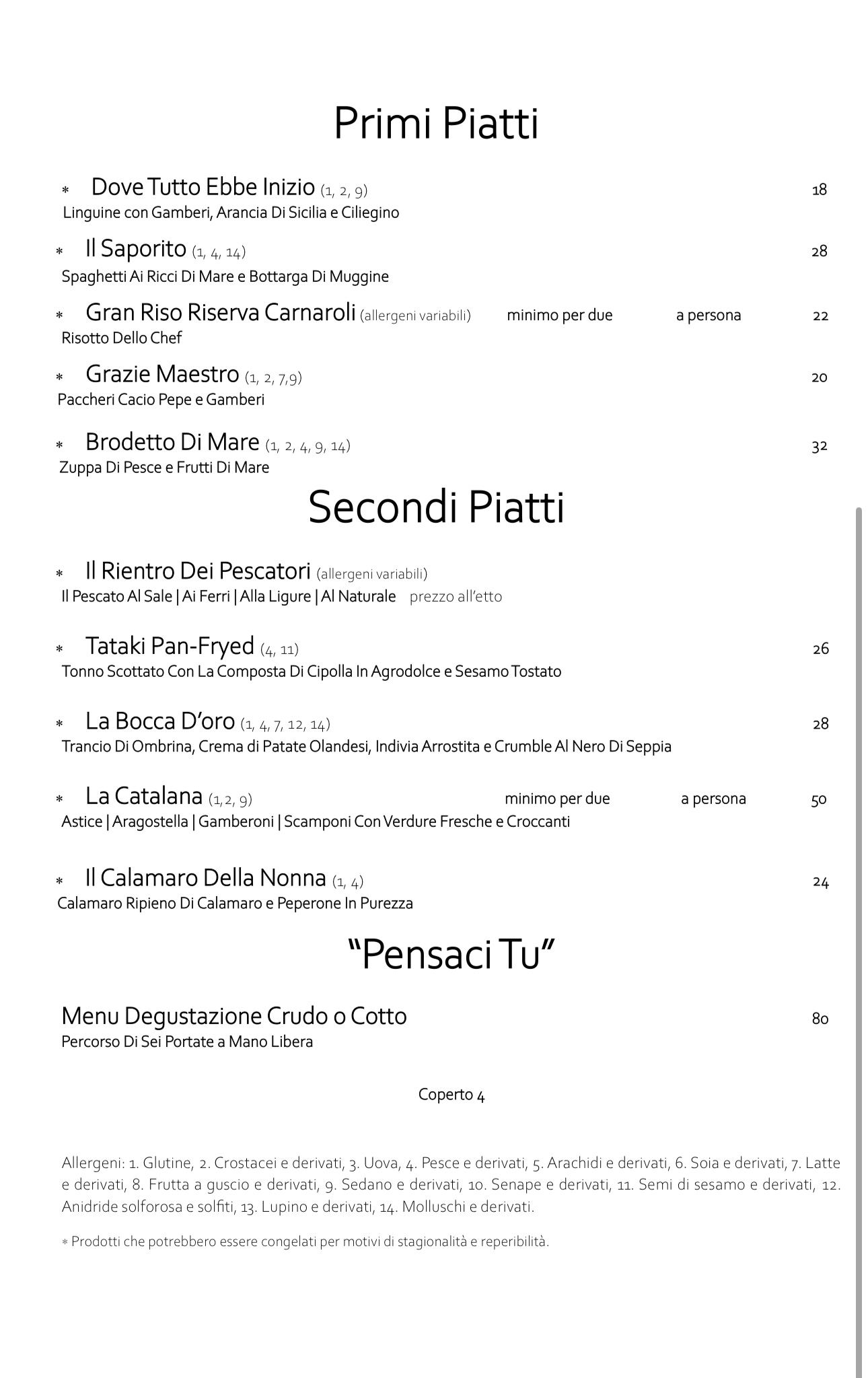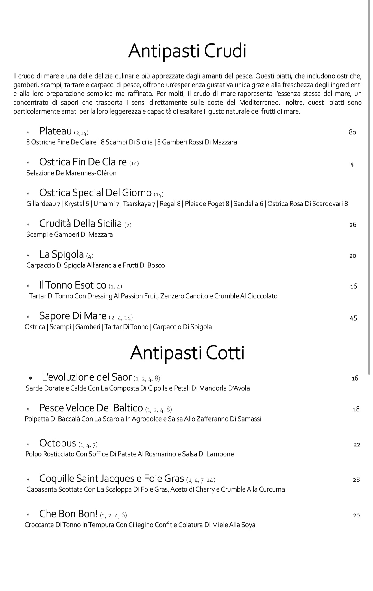 Menu Degustazione Crudo o Cotto Percorso di sei portate a mano libera Prezzo: €80 Coperto: €4